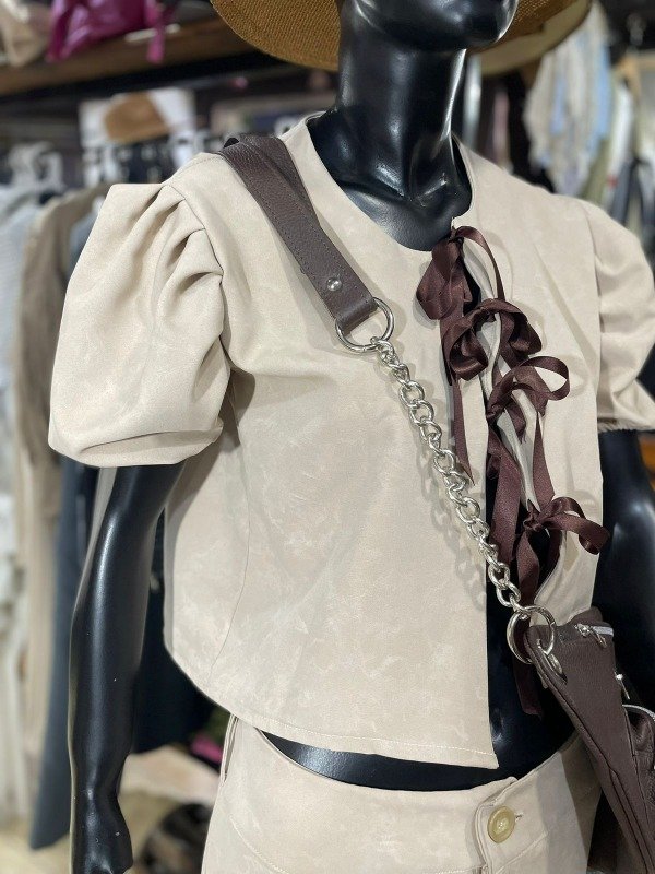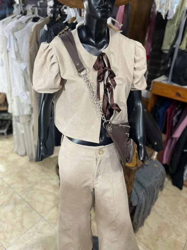 Blusa de tela sastrera, mangas princesas y moños en contraste. Queda un fuego con su conjunto.
