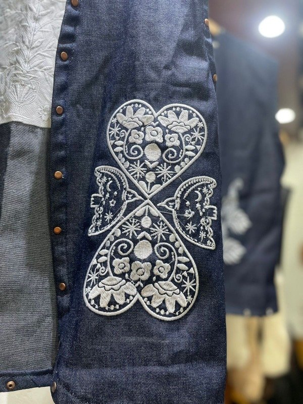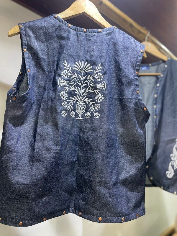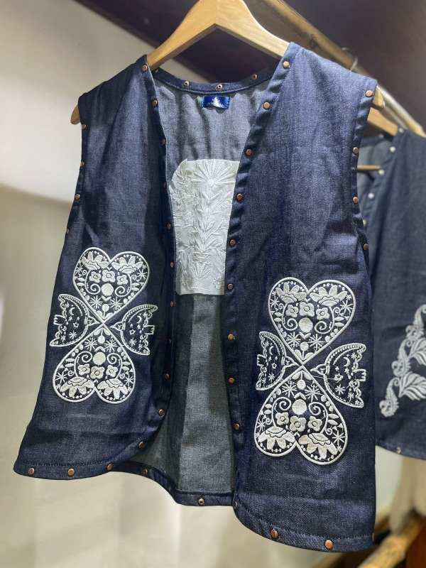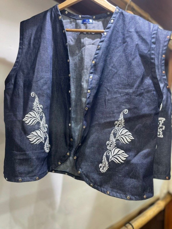 Chaleco sin forreria , bordado con diseño propio, detalles en tachas.