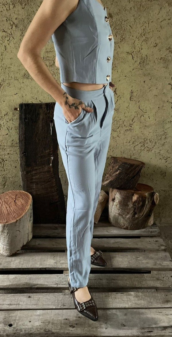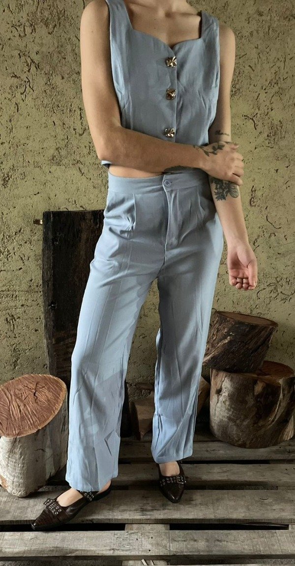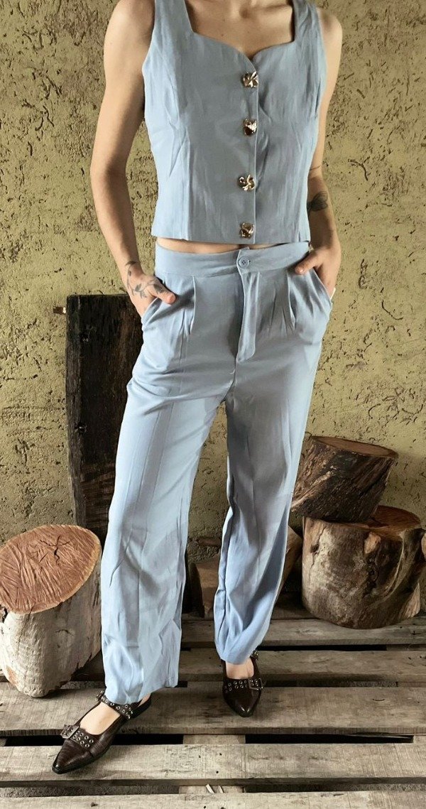 Conjunto sastrero de lino importado con blusa estilo chaleco forrado y pantalón recto pinzado.