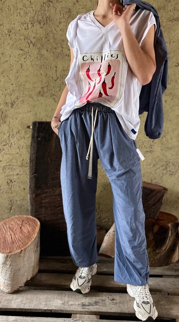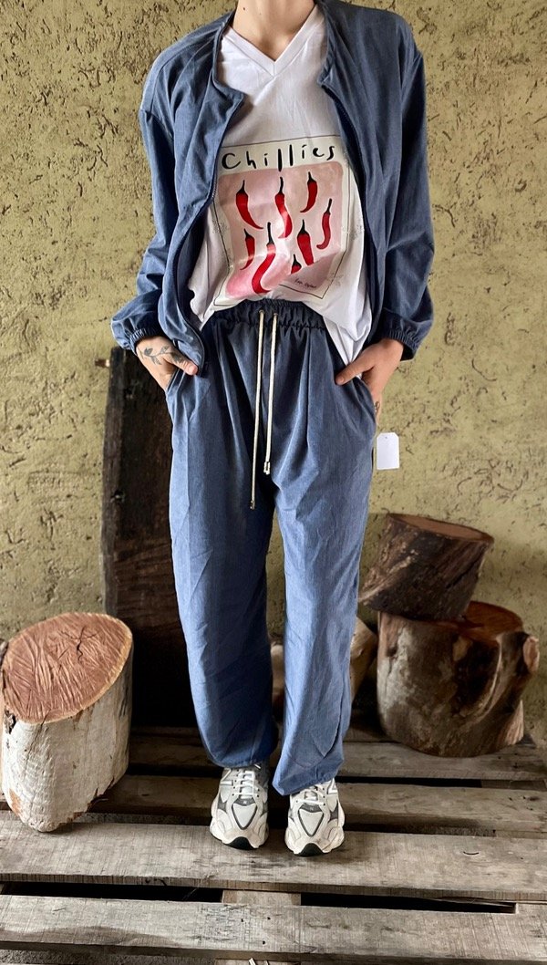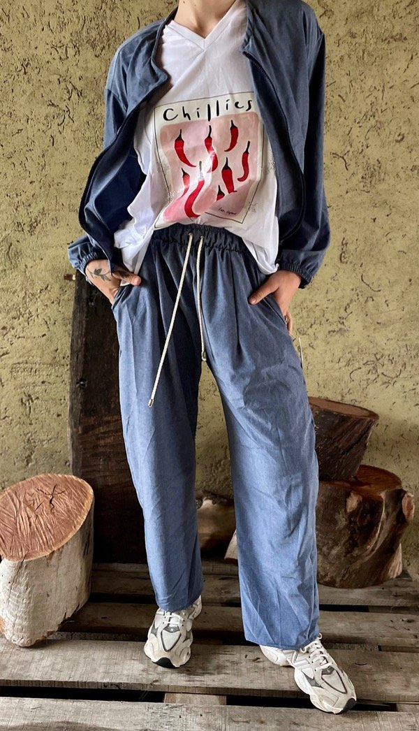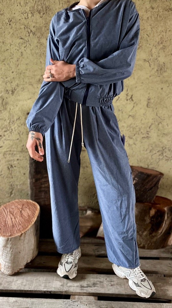 Set estilo urbano deportivo con tela impermeable. Campera con cuello base y babucha estilo banana con pinzas.