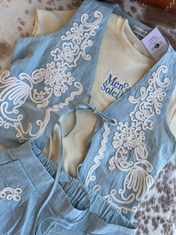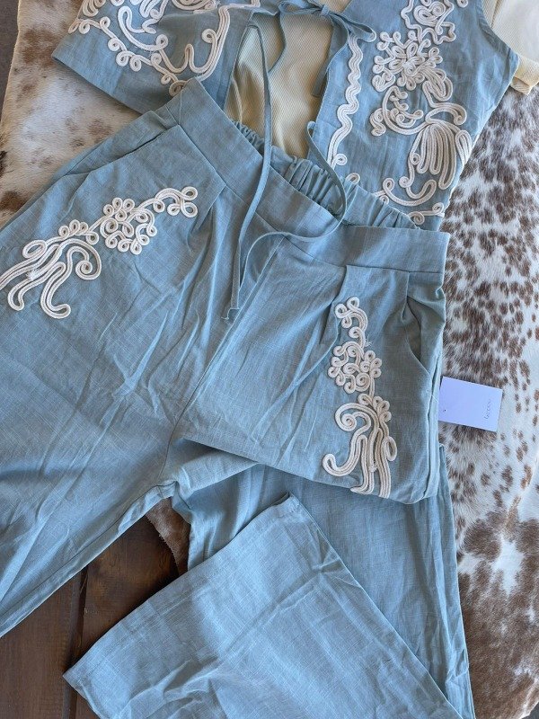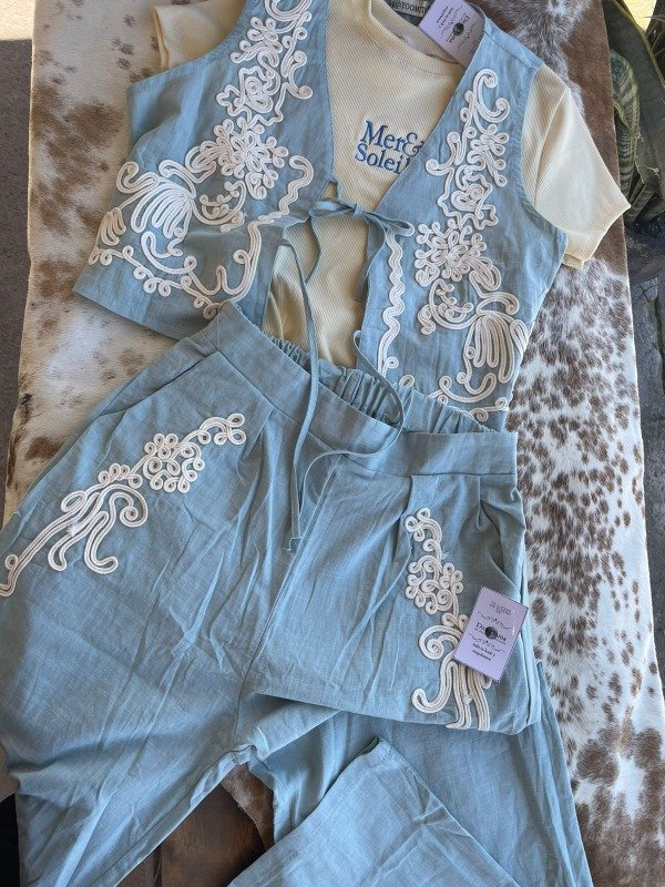Set de chaleco y pantalon wid leg con elástico en la cintura.Detalle de bordado, queda espectaculares.