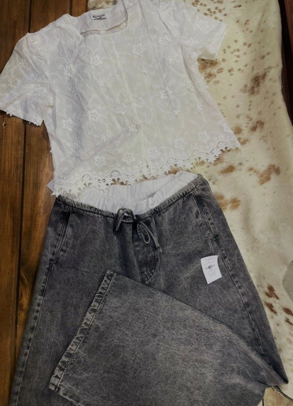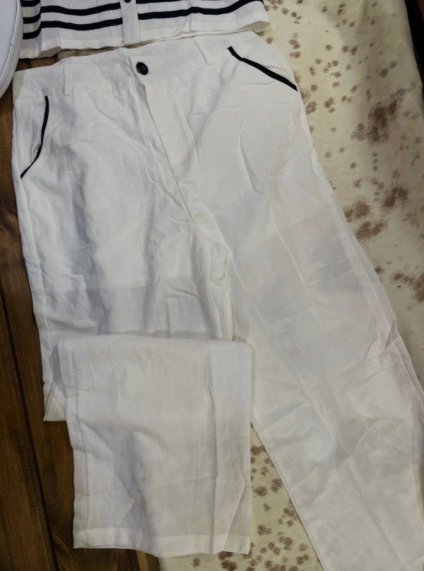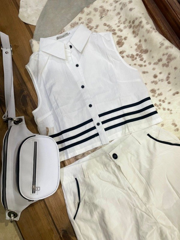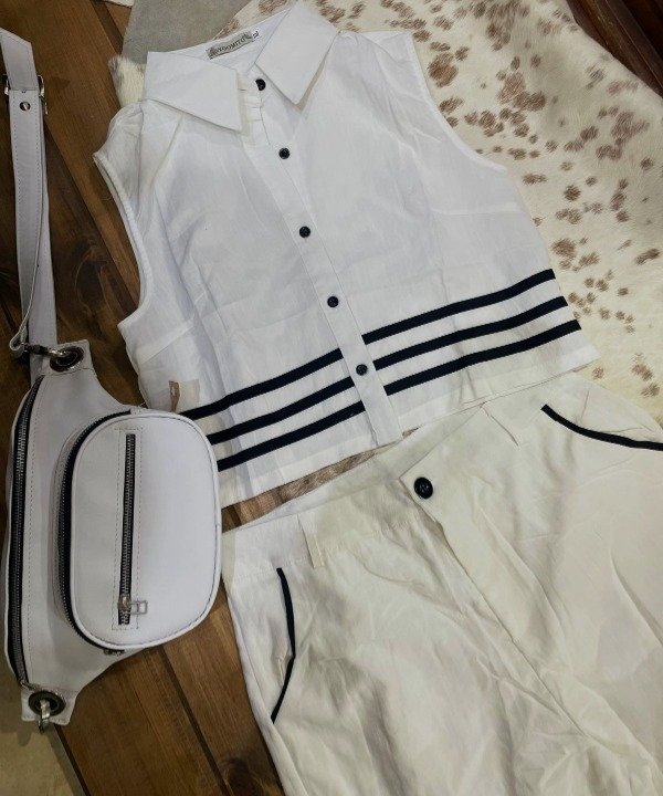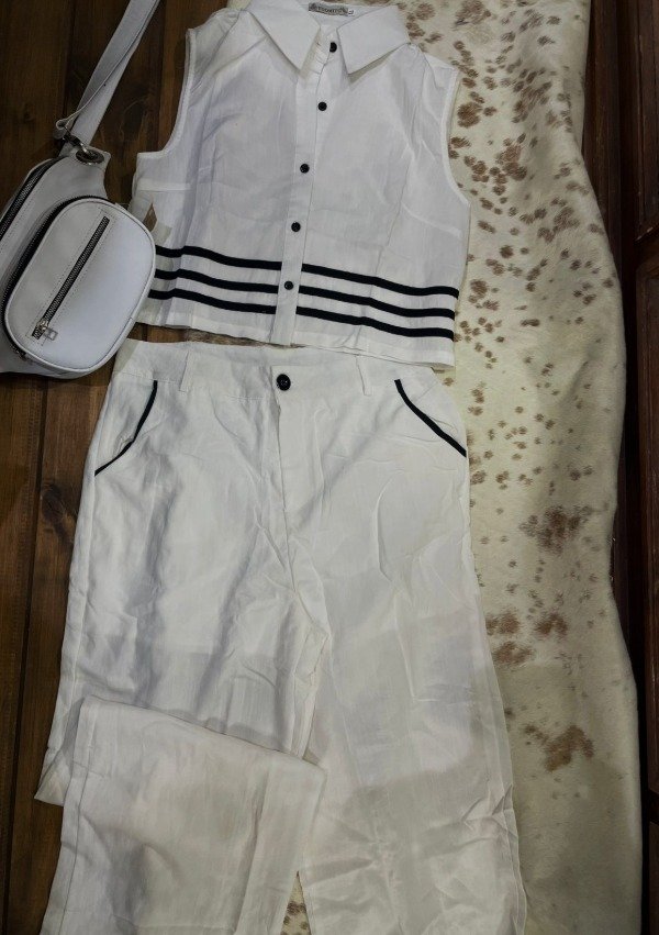 Set premium de lino importado con detalles en negro, contiene musculosa estilo chaleco con pantalón pinzado recto.