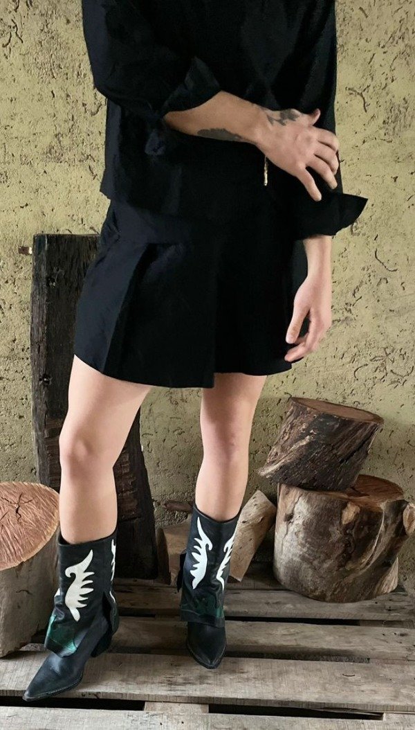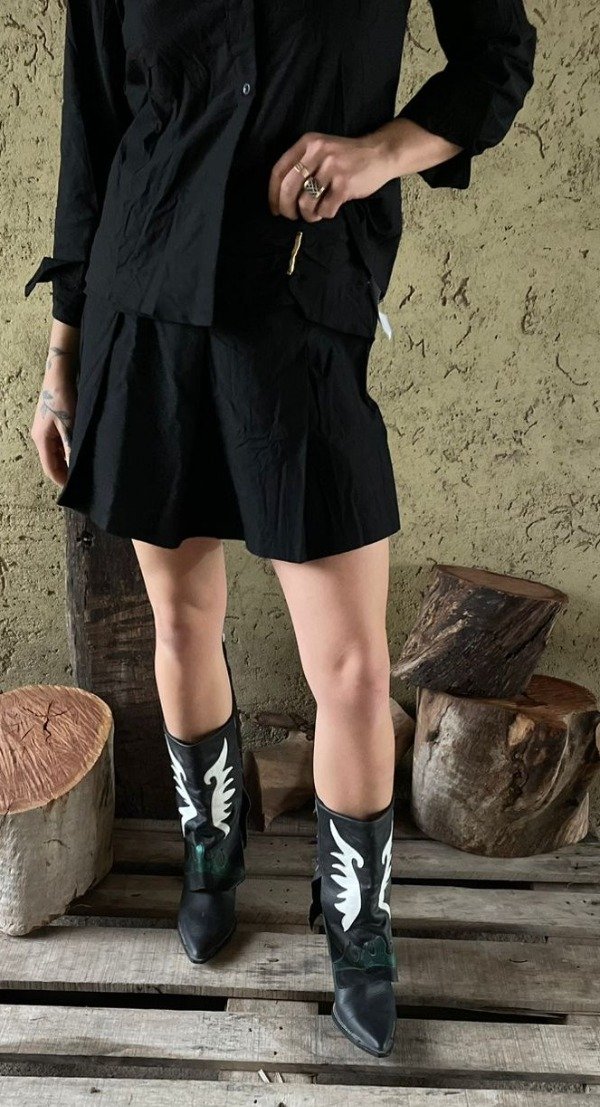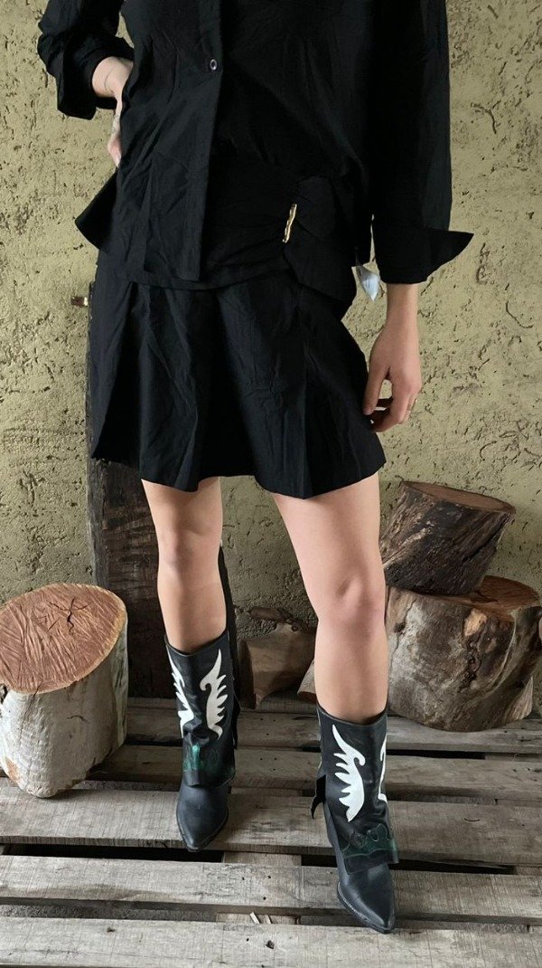 Set de camisa y pantalón pollera, con detalles drapeados. Tela elastizada.